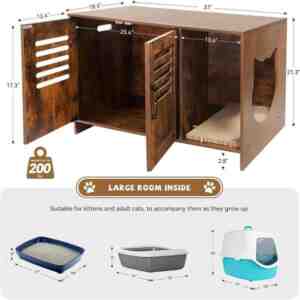 The Zerbuger Extended Litter Box Enclosure is a multifunctional piece of pet furniture that beautifully combines aesthetics with functionality. This innovative enclosure, designed in a rustic brown style, not only discreetly hides the cat litter box but also serves as a stylish side table or nightstand. It’s a perfect solution for cat owners who want to maintain a clean and elegant home environment while providing their feline friends with privacy. The enclosure is spacious enough to accommodate large cats and most litter box sizes, with dimensions of 24.8” L x 18.5” W x 18.5″ H for the litter box space and overall dimensions of 37″ L x 18.5″ D x 21.6″ H.